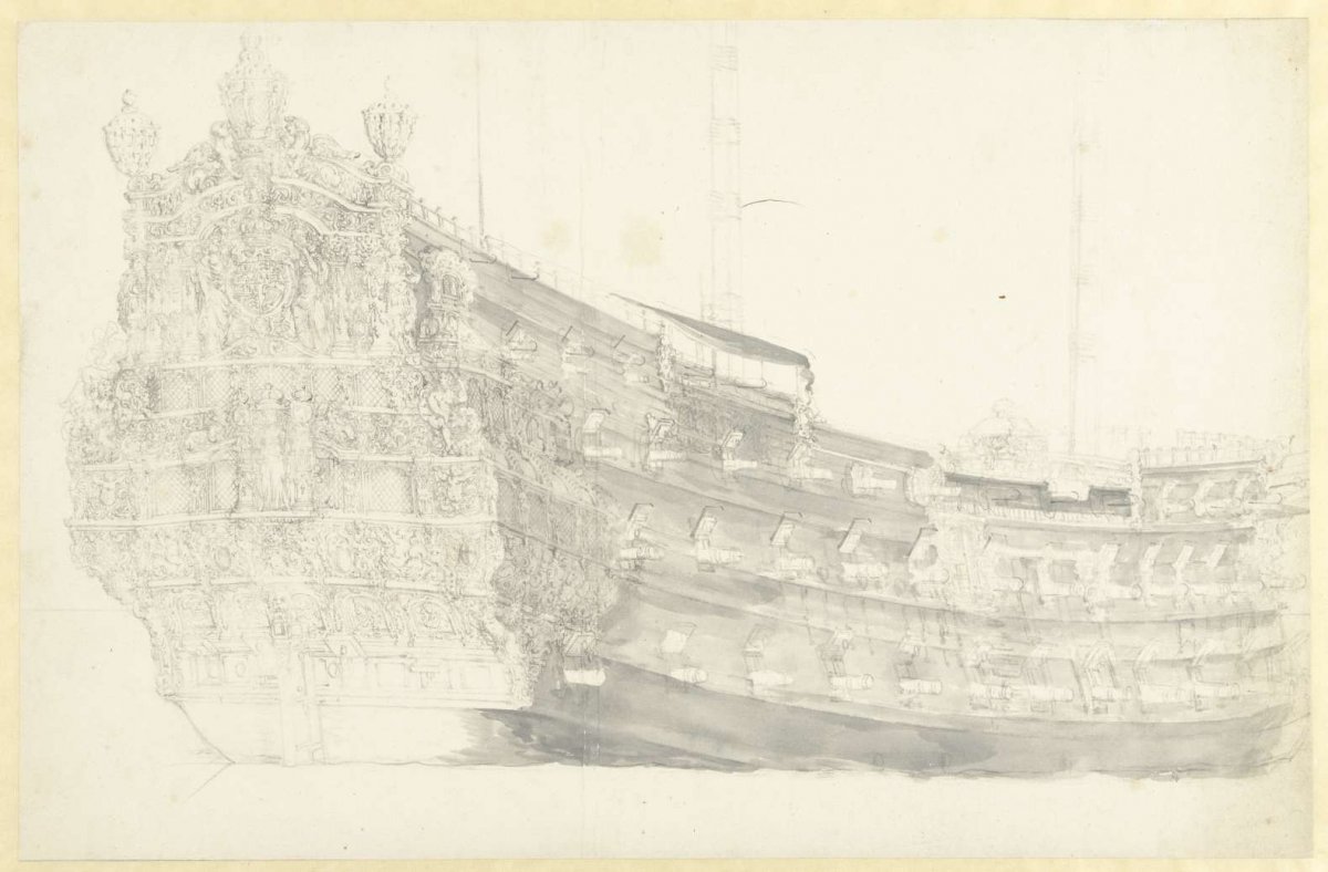 Description: Portrait of a (fancied?) English ship with Justice on the transom. That this is a counterprint is shown, among other things, by the fact that the letters R and C and the coat of arms of England, the Stuart Royal Standard, are in mirror image. The letters should therefore be read as CR (Carolus Rex). It cannot be ruled out that this is a fantasy ship. Indeed, the drawing shows great similarities to two other reproduced counterprints of the old Van de Velde in Rotterdam, one of which bears the caption: vervolgende schepen heeft vande velde / naer eÿgen fantazÿen geordineert / & geschiert. Like the drawing in the Rijksprentenkabinet, the English fantasy ships in Rotterdam have a sculpture of Lady Justice, recognizable by sword and scales, on the transom. There are more counterprints of English ships probably conceived by Van de Velde himself. A number of these are on paper with the same watermark as the drawing described here, a mark found mainly in the second half of the 1660s, but occasionally around 1672-73. Related by Muller to the voyage to Chatham, 1667.